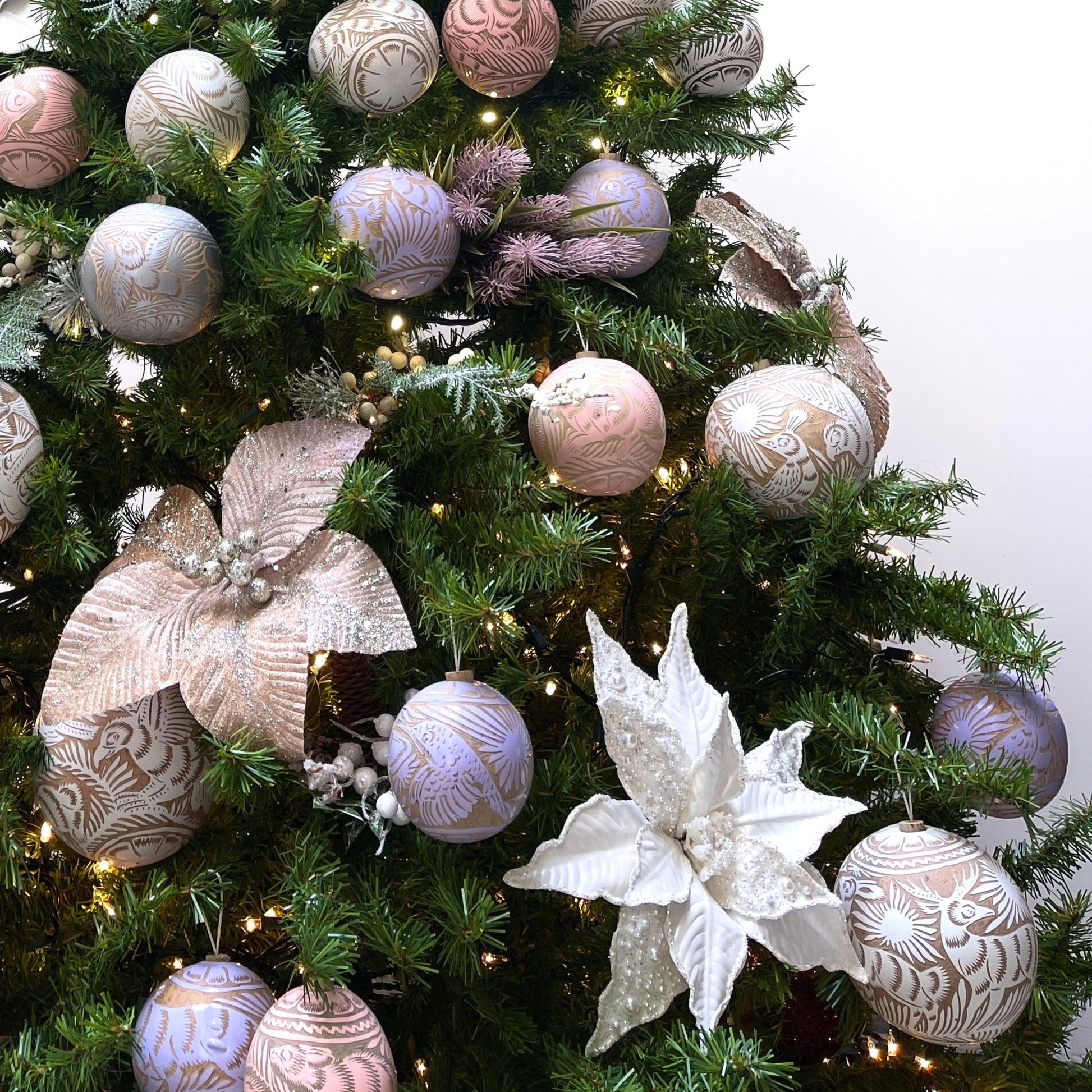 Estas bellas esferas 100% naturales tienen su origen en el árbol crescentia crujete, mejor conocido como “árbol de jícara”, presente en la Región Costa de Oaxaca. Para la elaboración de cada pieza, el fruto es pintado y tallado a mano, representando fauna y flora local.