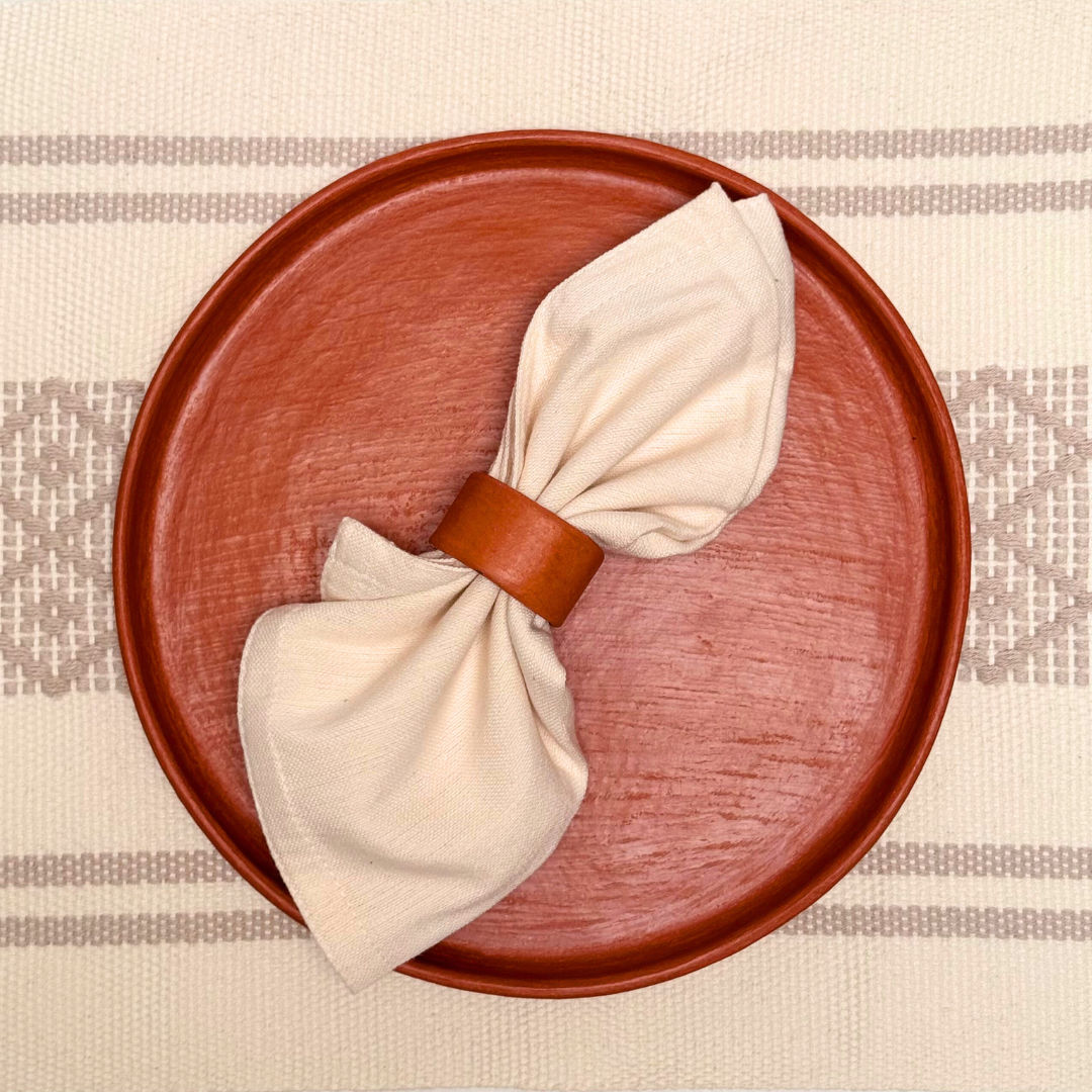 Este anillo liso para servilleta de cerámica artesanal celebra la belleza de lo simple. Hecho a mano en Santa María Tavehua, Oaxaca, su forma limpia resalta la textura y el color natural del barro. Ideal para mesas cotidianas o celebraciones especiales.